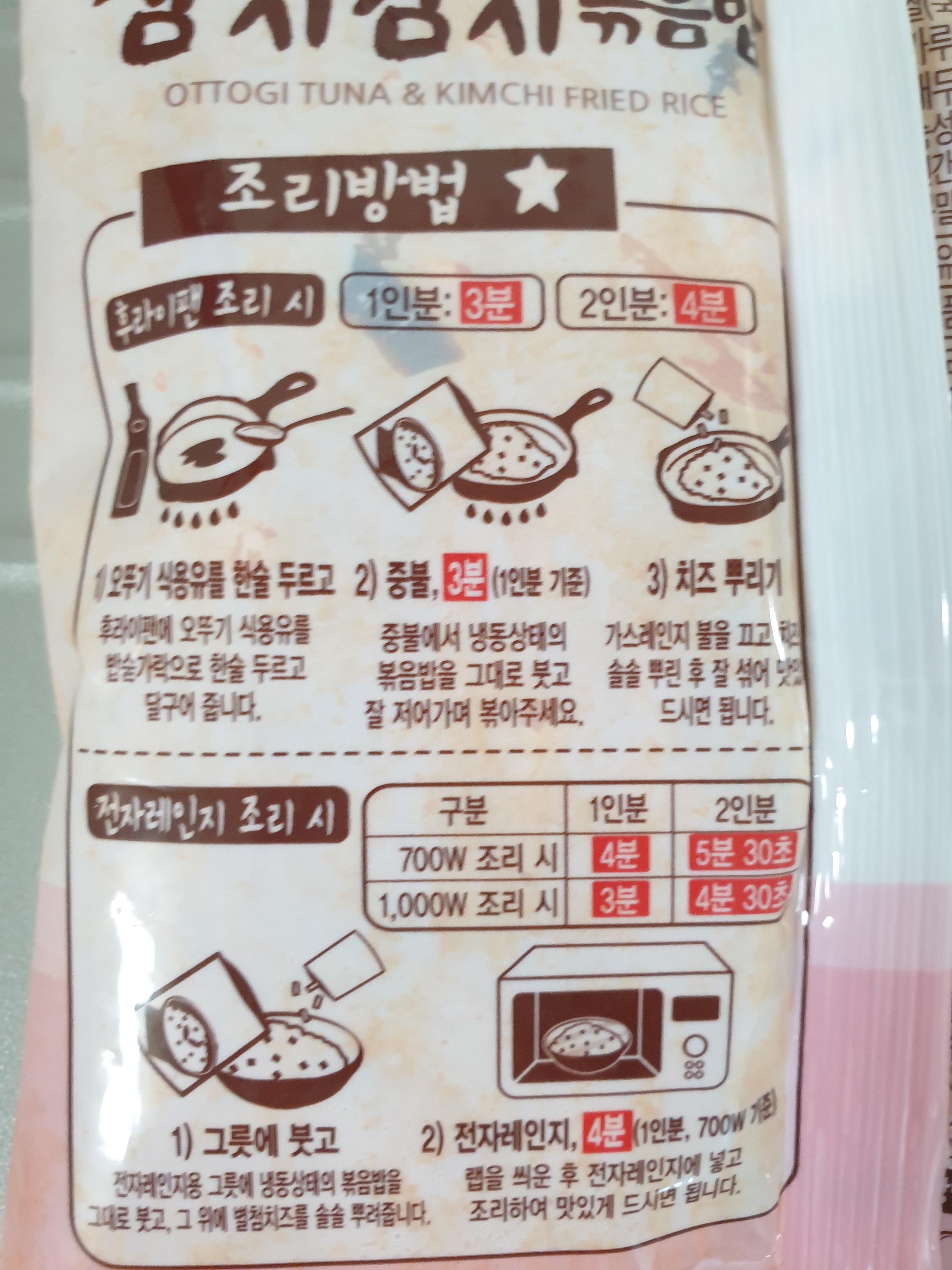 조리 방법은 후라이팬과 전자레인지가 있는데, 프라이팬은 설거지하기가 귀찮으니 전자레인지로 할 것이다.