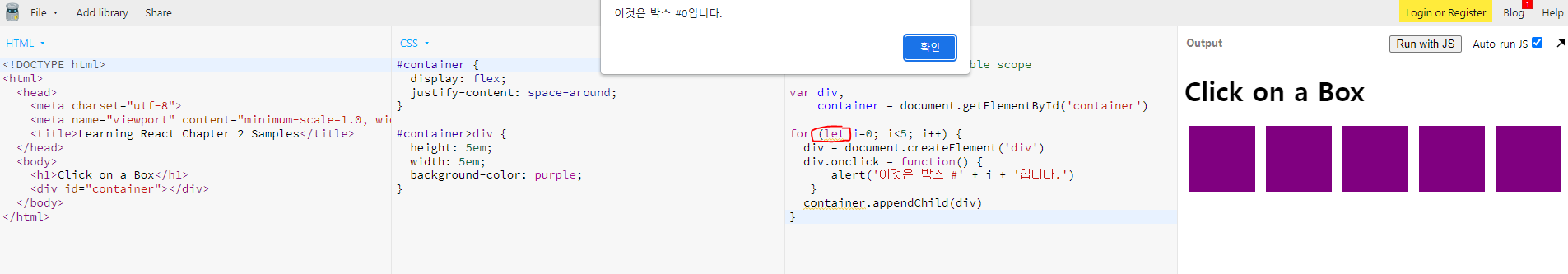 [그림 4] for 안에 let 변수를 넣고 함수를 넣어 돌린 경우, 박스별로 다른 값으로 나온다.