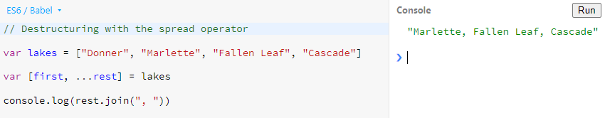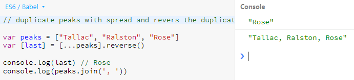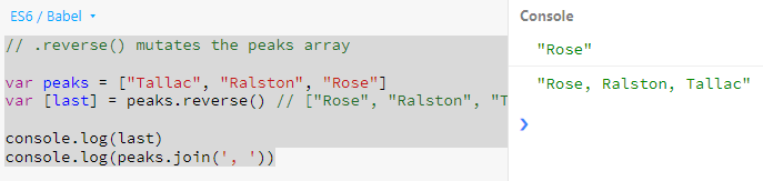 var [last] = peaks.reverse() // ["Rose", "Ralston", "Tallac"]