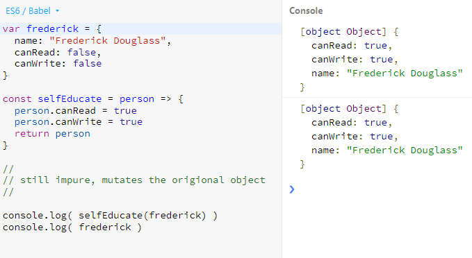 만약 전달받은 인수를 불변 데이터로 취급한다면, selfEducate는 순수 함수가 됐을 것이다.