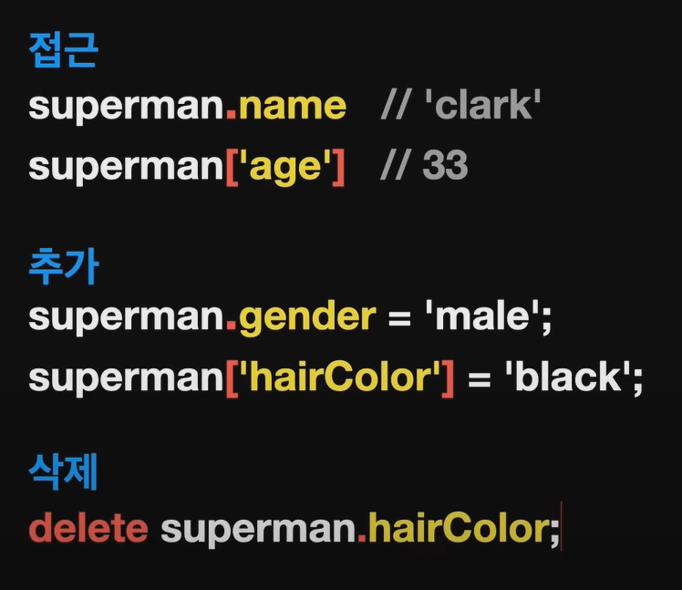 superman.birthDay; // undefined 존재하지 않는 값 출력
