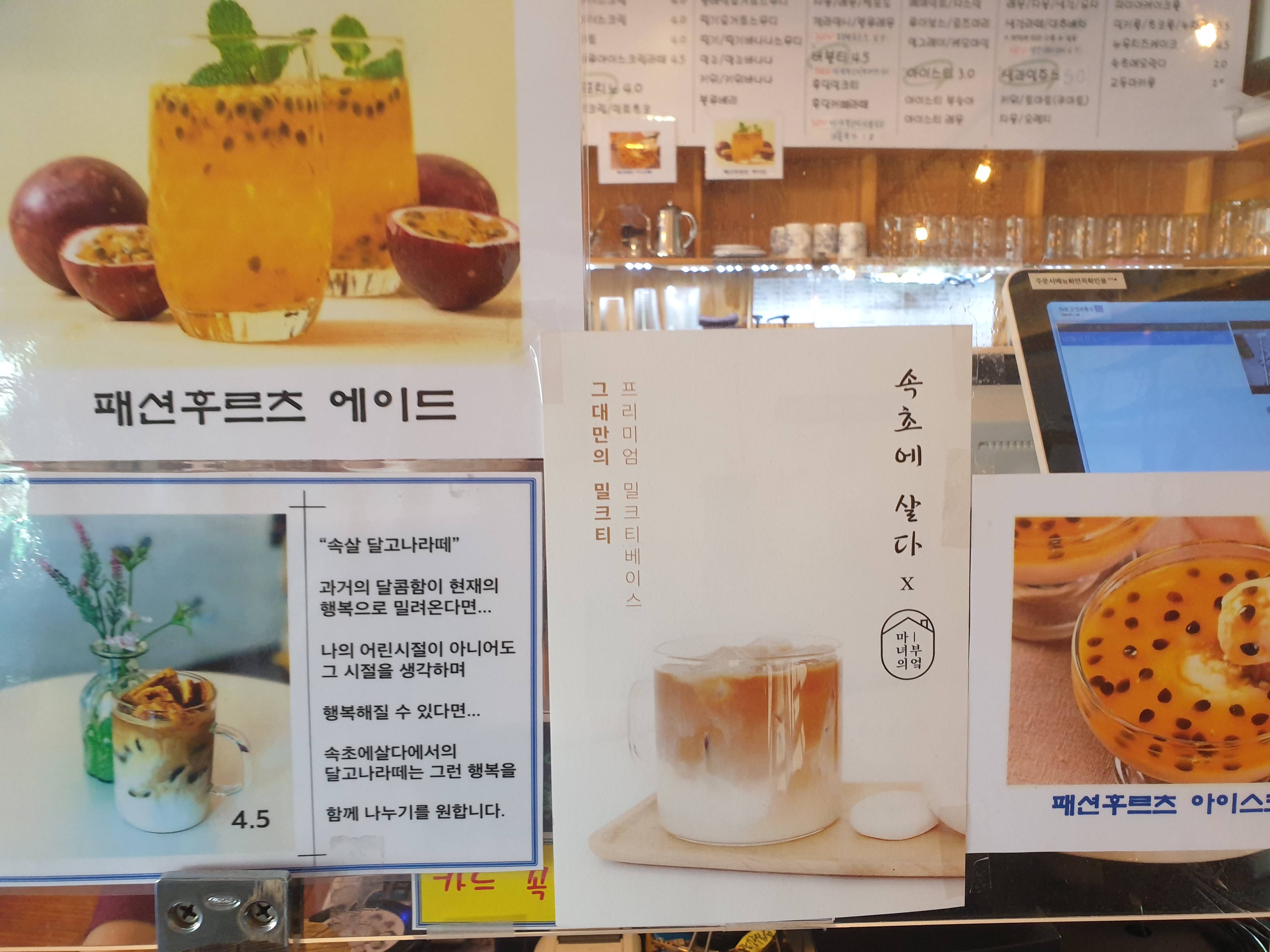 패션후르츠 에이드, 패션후르츠 아이스크림, 속살 달고나 라테, 밀크티 등